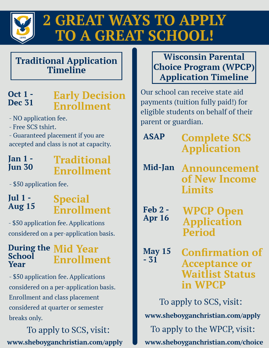 You can apply directly to SCS, and submit your application through the Wisconsin Parental Choice Program (WPCP) if applicable. The following graphic will help you understand the admissions timelines for each of these: