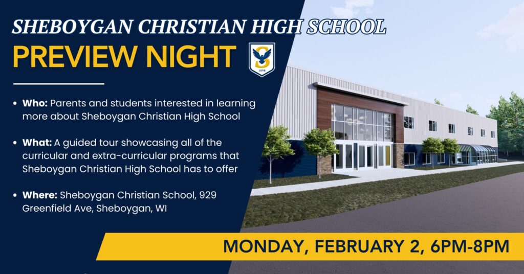 We are excited to host a High School Preview Night on Monday, February 2 from 6:00-8:00pm. This preview night will include a guided tour of our campus, a presentation on our mission, vision, and values, Teaching for Transformation curriculum, and more on what our school has to offer your child. We also look forward to sharing the exciting future plans of our high school campus! Take this great opportunity to preview high school at Sheboygan Christian School!
